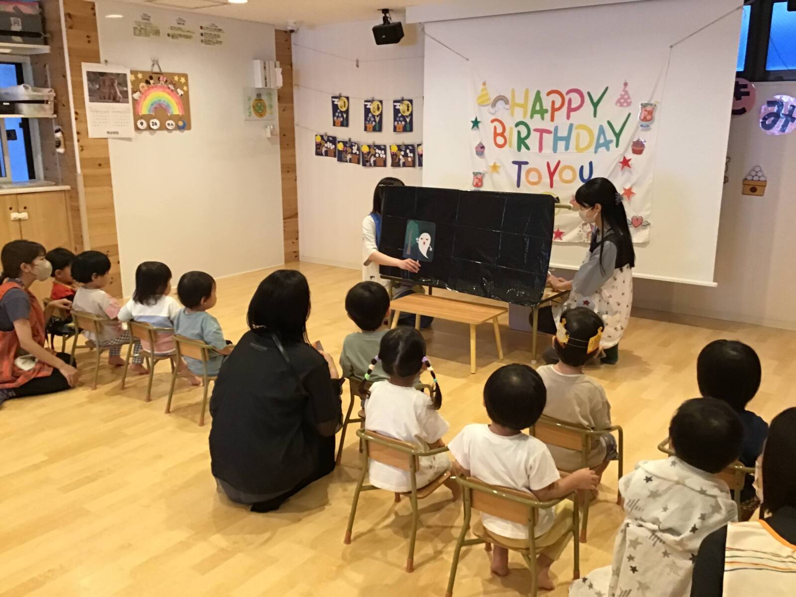 お楽しみは長町園にもあり、お子様達に親しみのある絵本「おつきみおばけ」のペープサートでした🥰