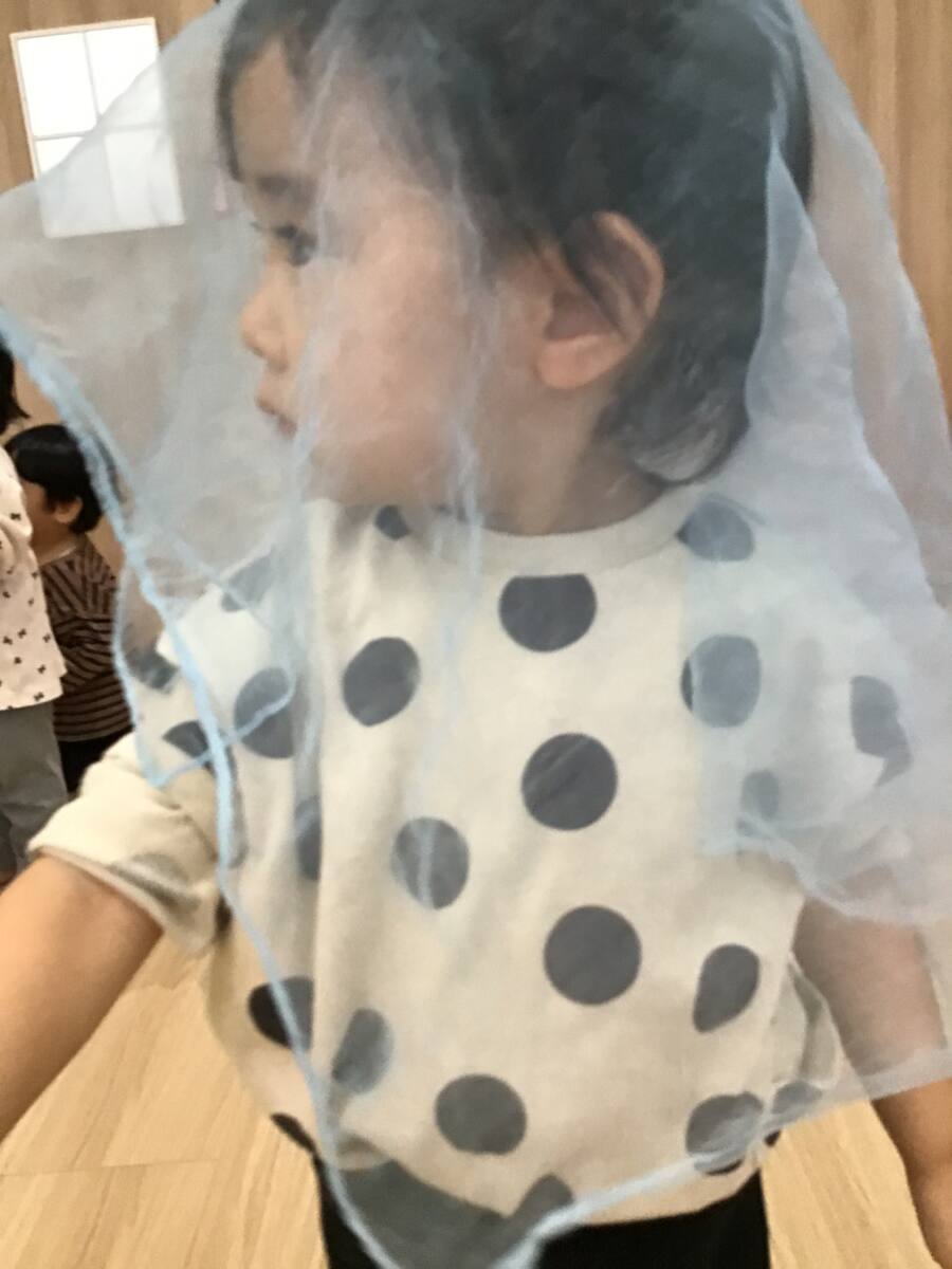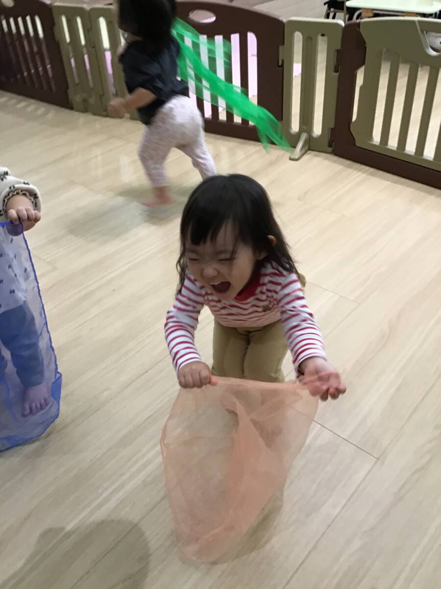 スカーフを使って「にぎりぱっちり」やおばけのリトミック、「どんぐりころちゃん」を行いました!