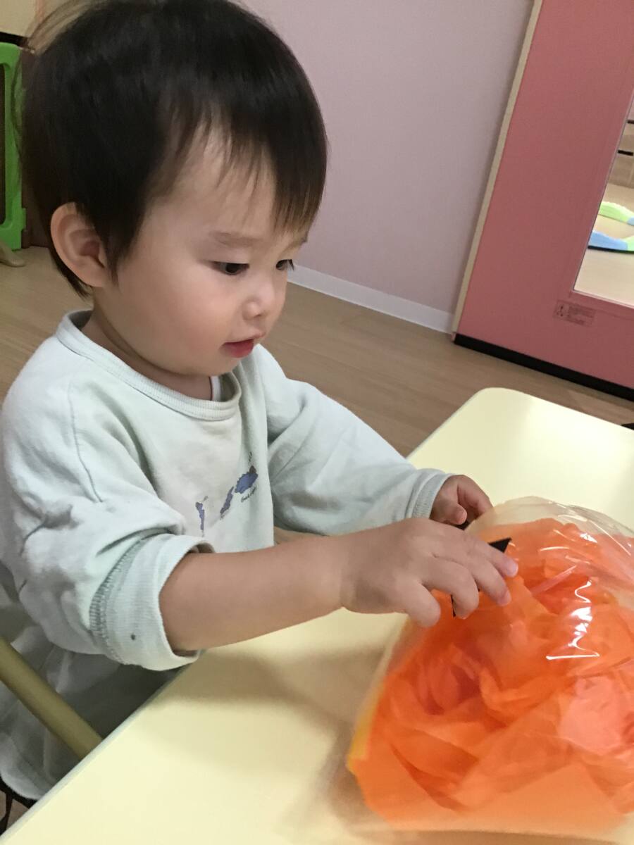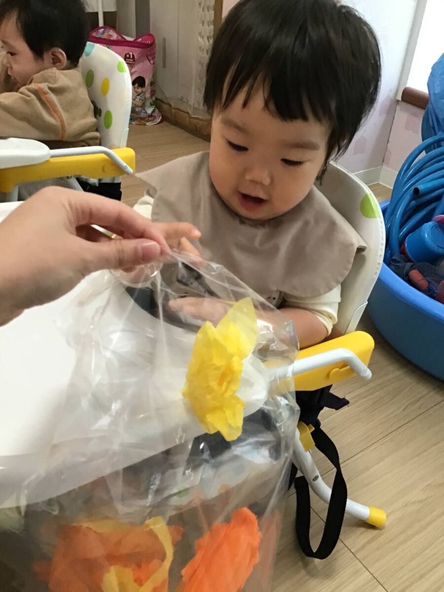ビニール袋に花紙を丸めて入れ、おばけやかぼちゃを作りました🎃👻