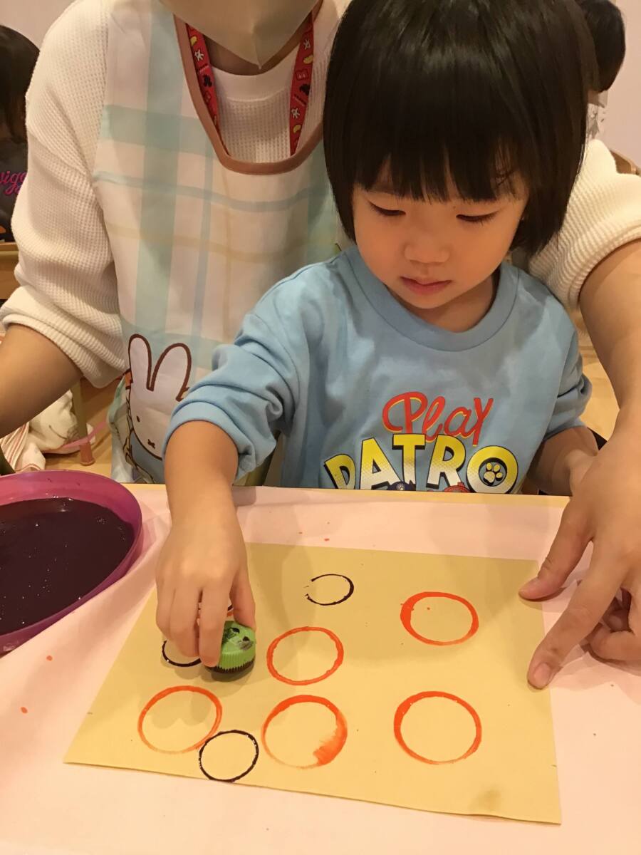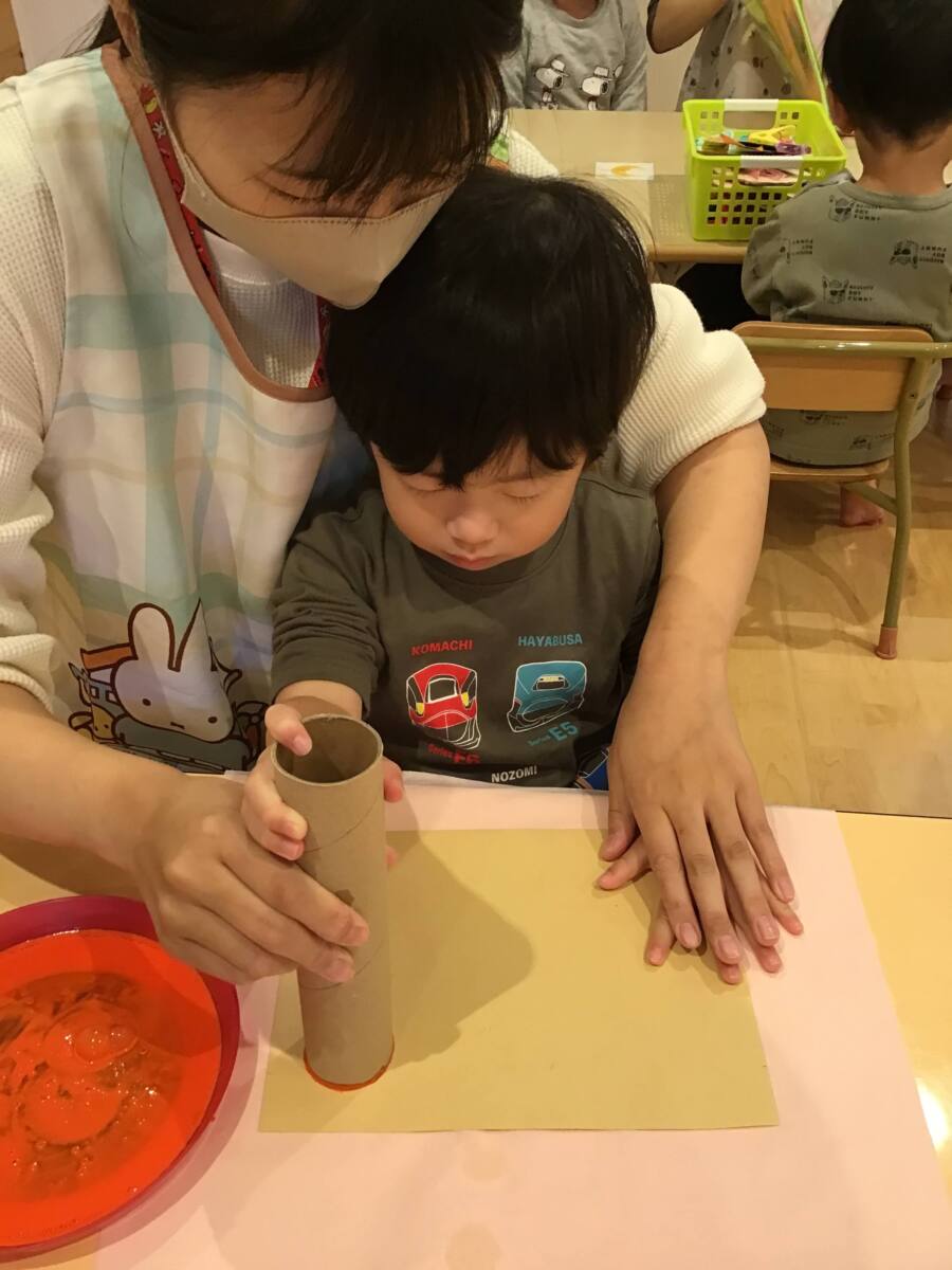 廃材の芯やペットボトルのキャップなど身近なものでいろいろな〇スタンプを楽しみましたよ😊