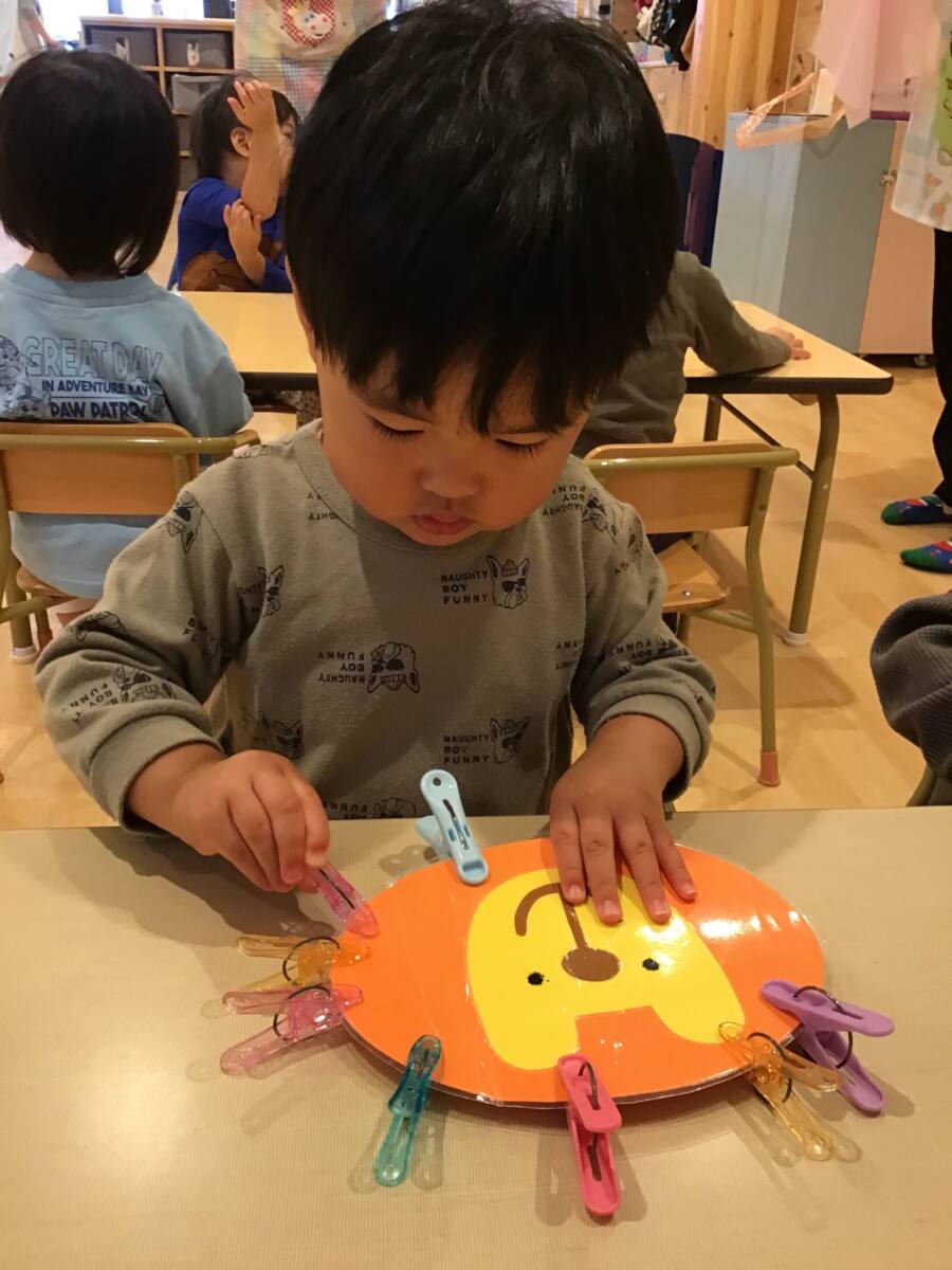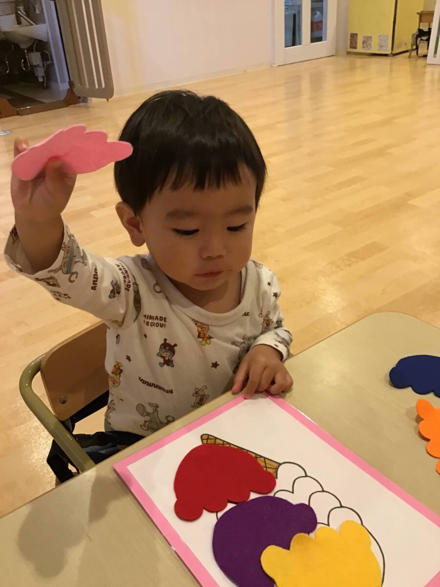るなさんは洗濯バサミを使った遊びで指先の使い方を練習したり、色に興味をもちながらアイスクリーム作りをしたり❕