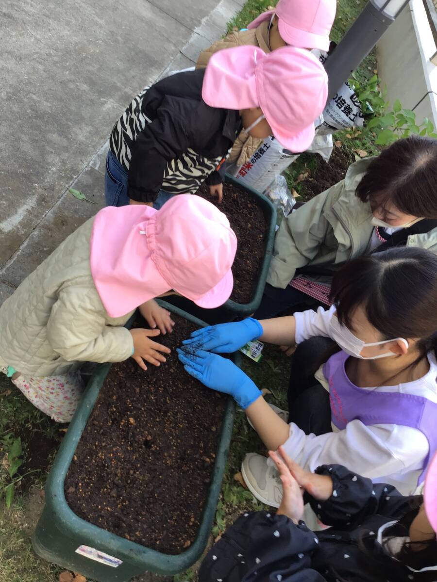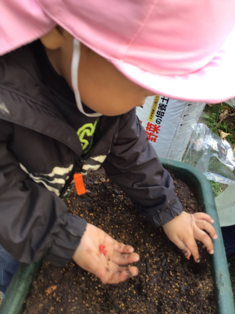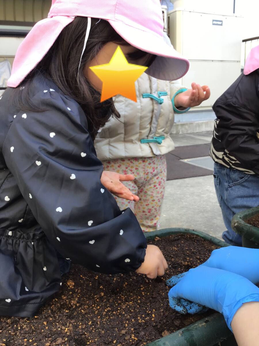 指で土に穴をあけて種をまいて、最後に優しく土のお布団をかけます♪