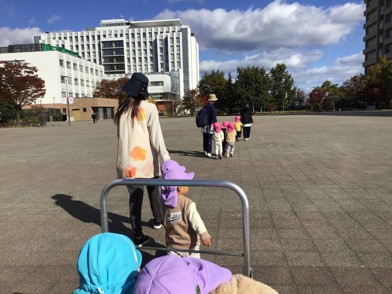 秋晴れの心地良い天気の中、3クラス一緒にお散歩を楽しみました🍂