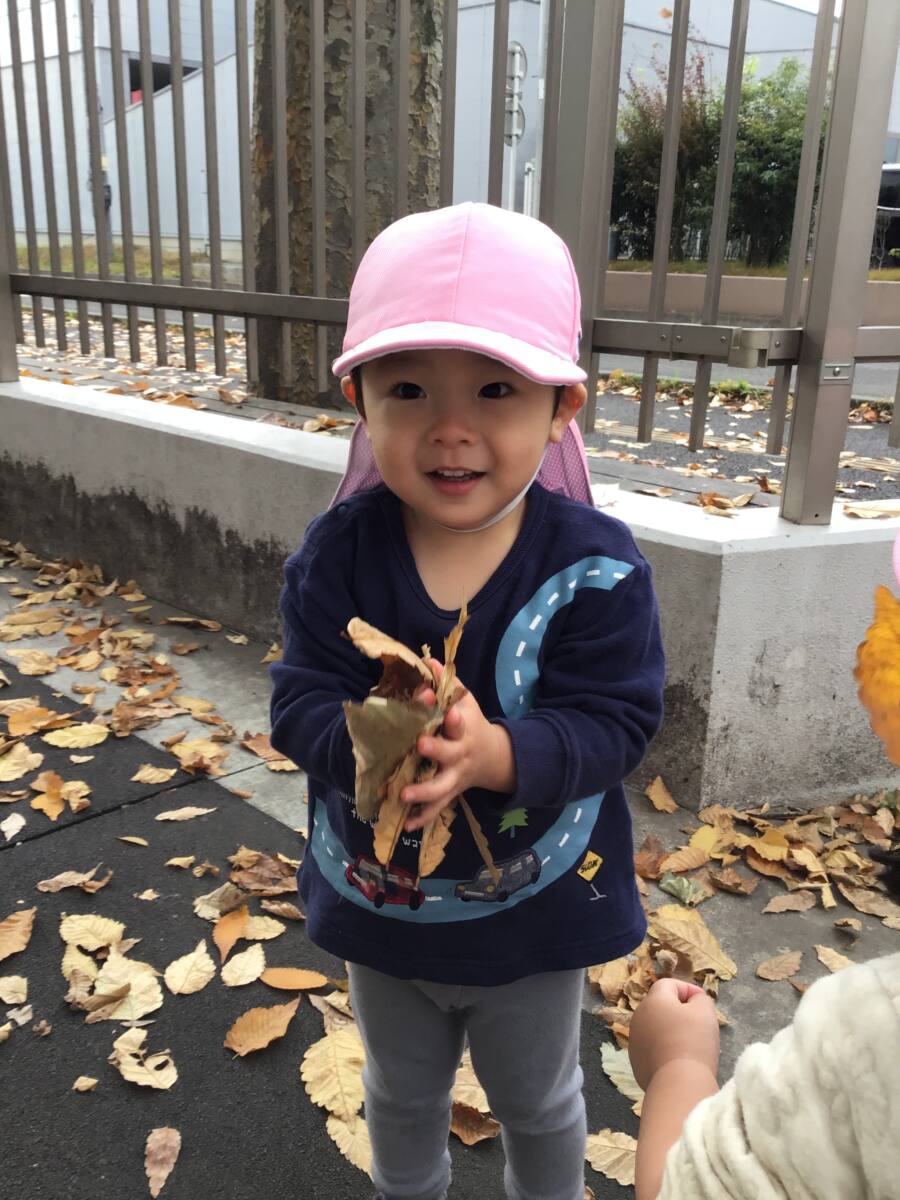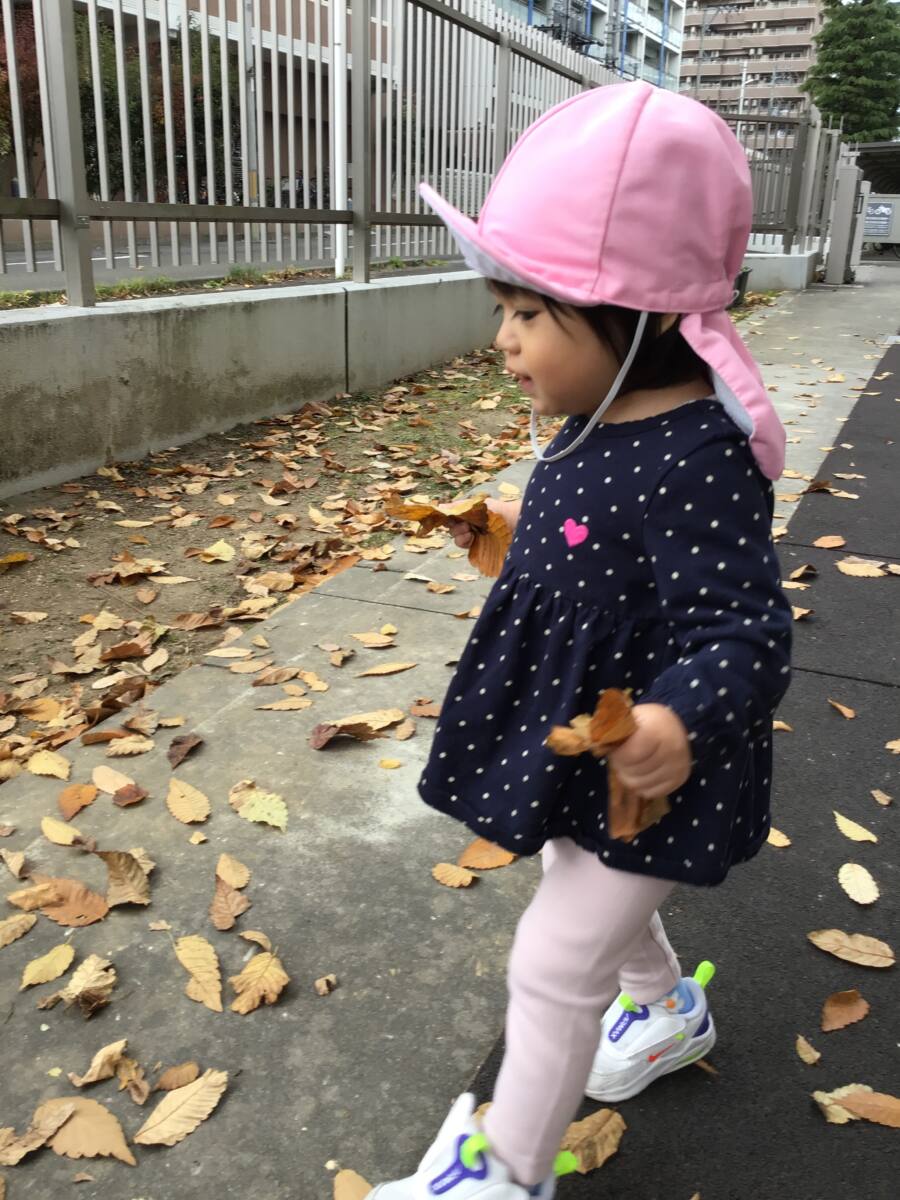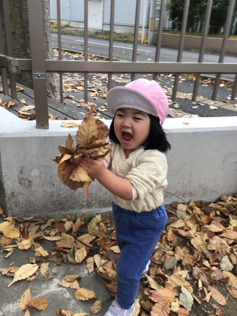 沢山の色付いた落ち葉の中、かけっこをしたり落ち葉拾いをしたりと