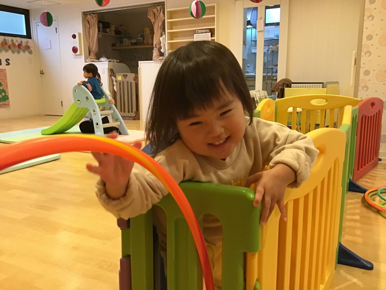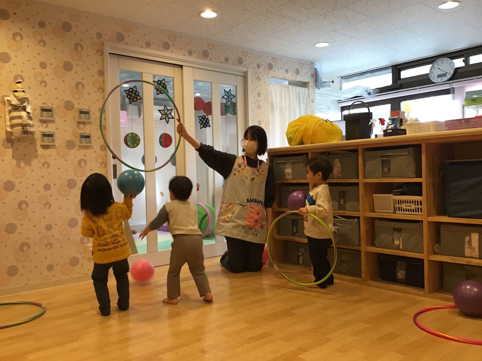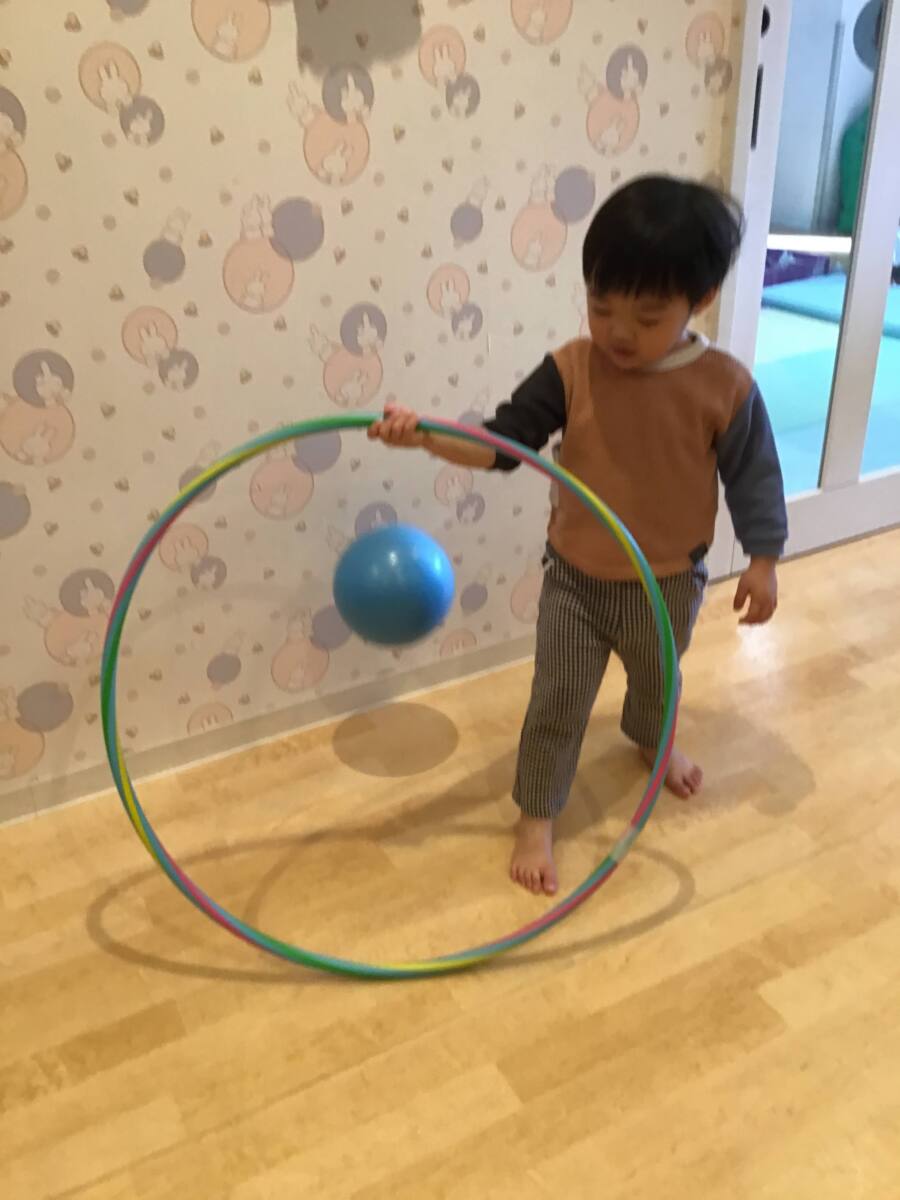 室内に戻ってからはフラフープうやボールなどのコーナーで遊んだあからさん、るなさん💗
