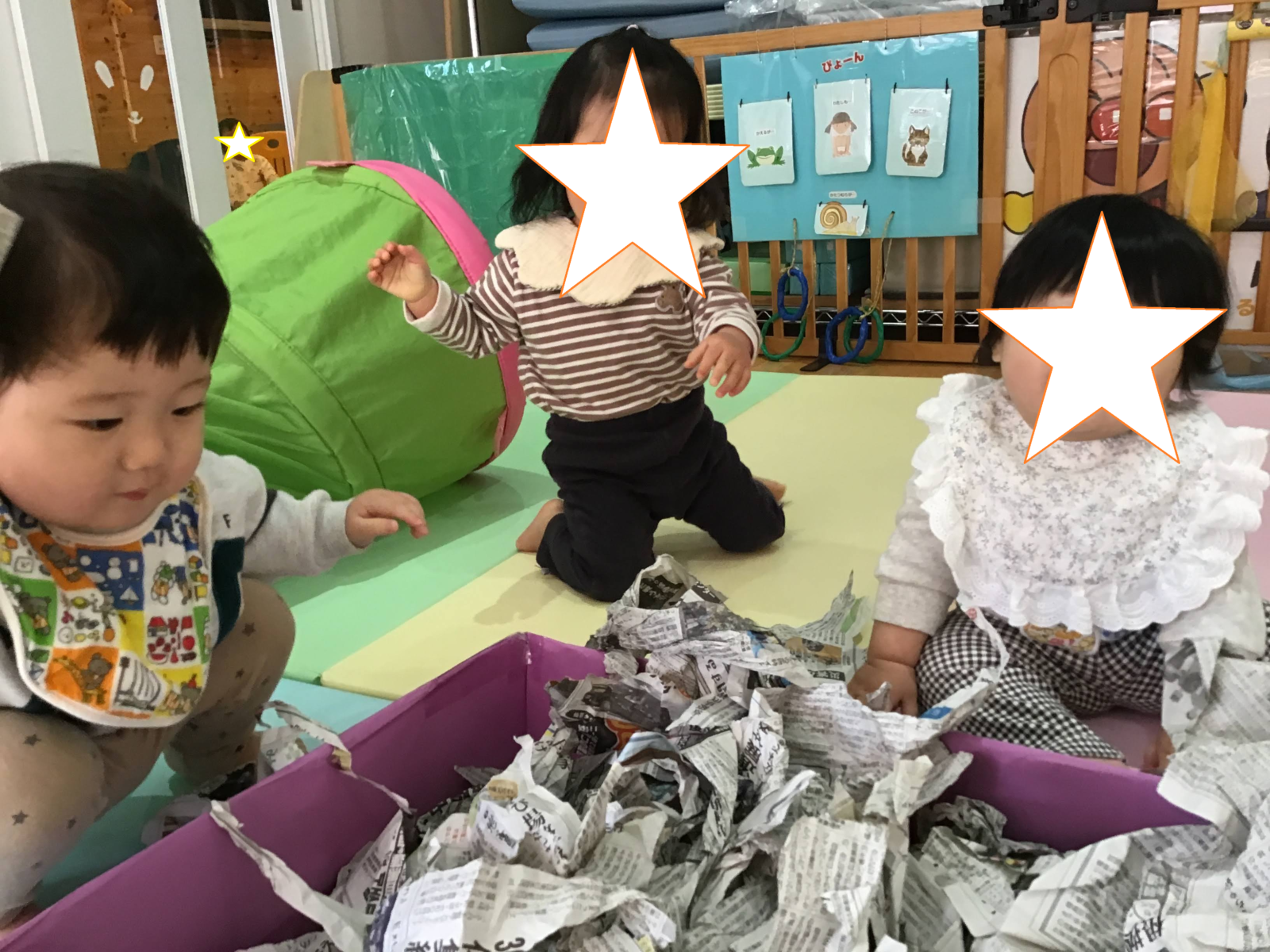 すてらさんは、ほふく室でマットやトンネル、新聞紙遊びを楽しみました⭐