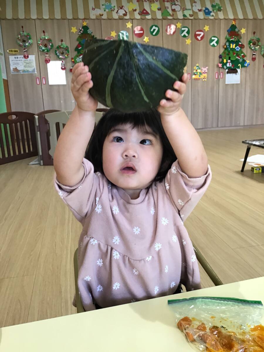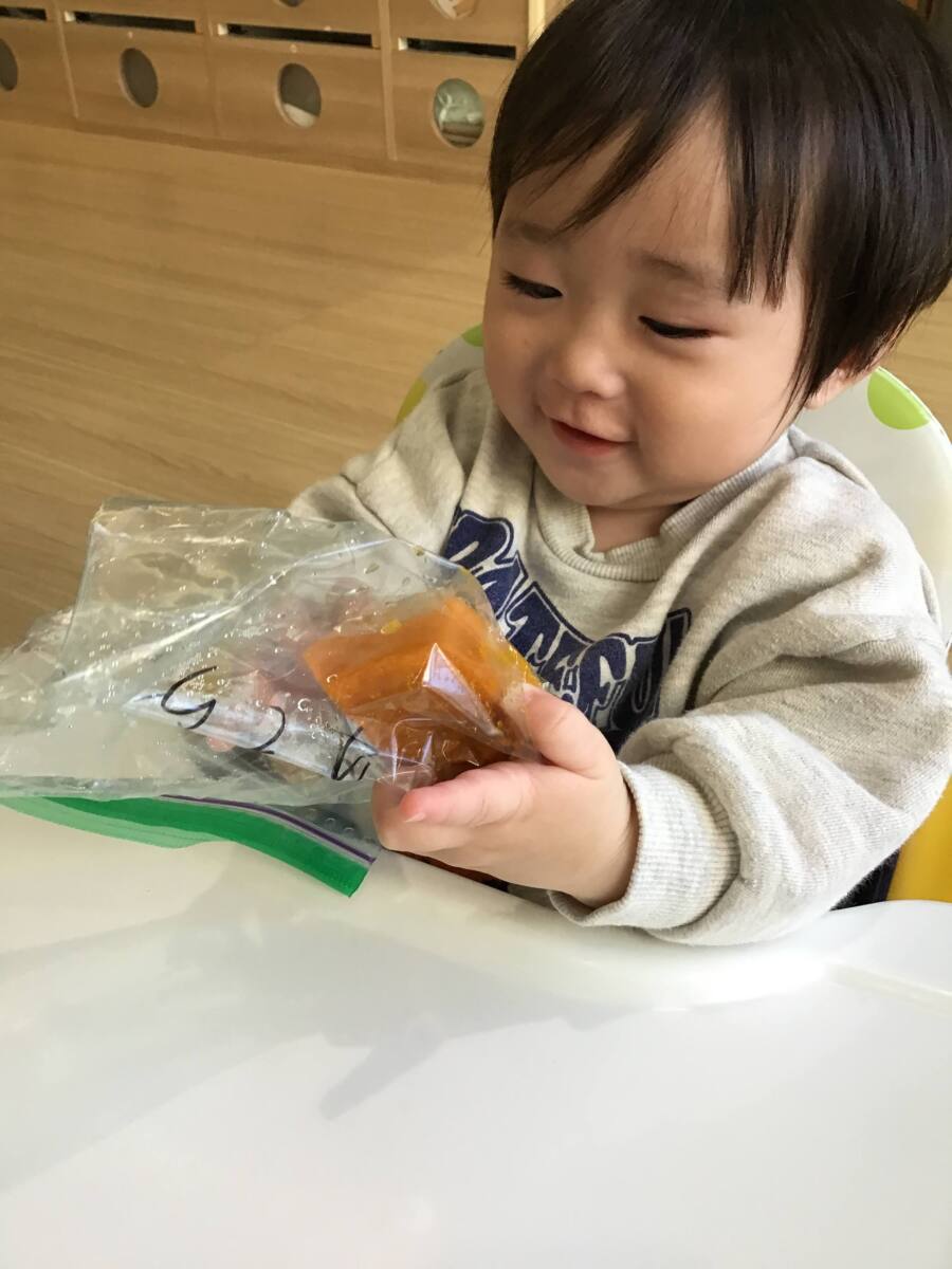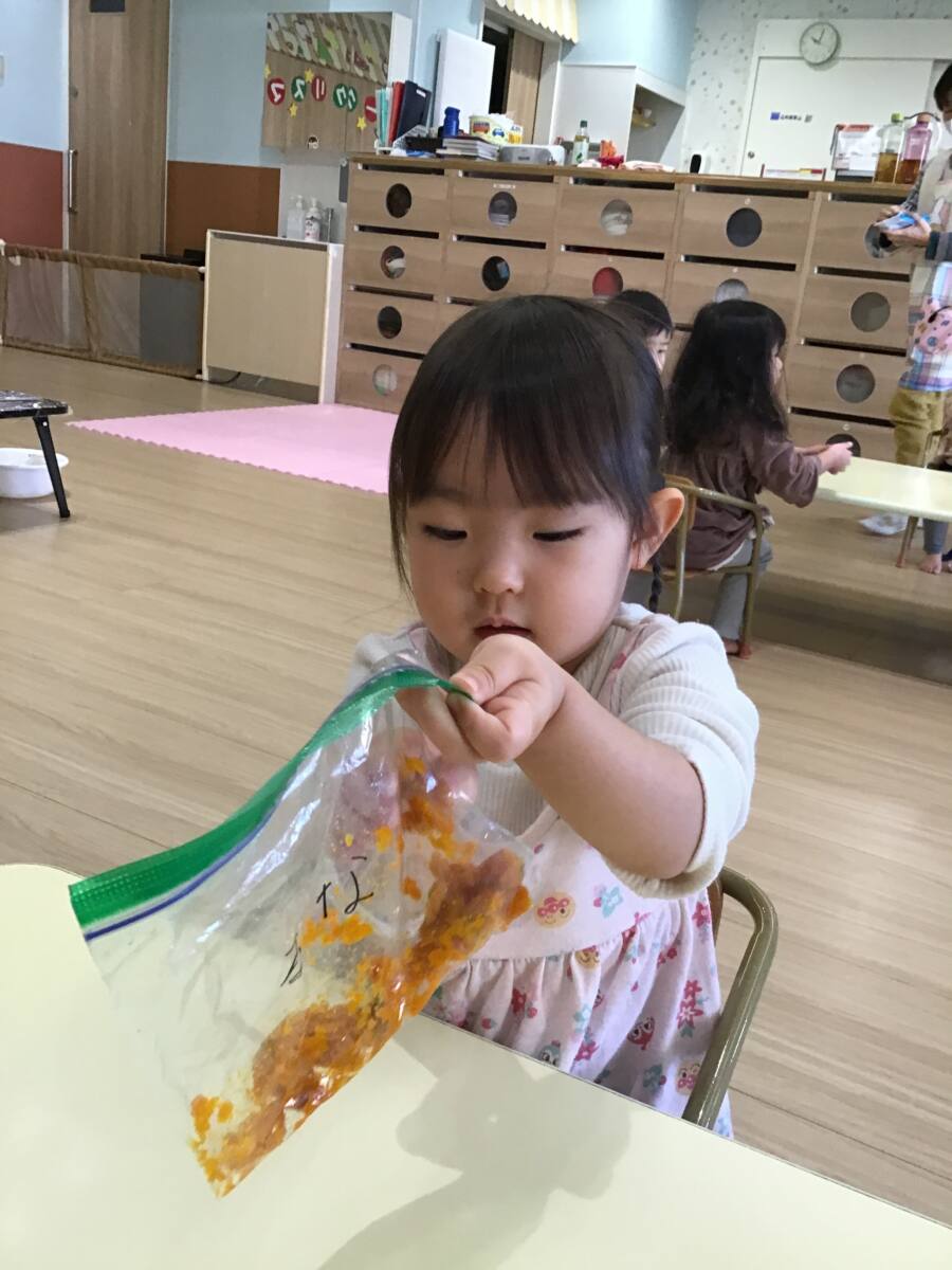 ジップロックに入れたカボチャを潰して食材に親しみました💓