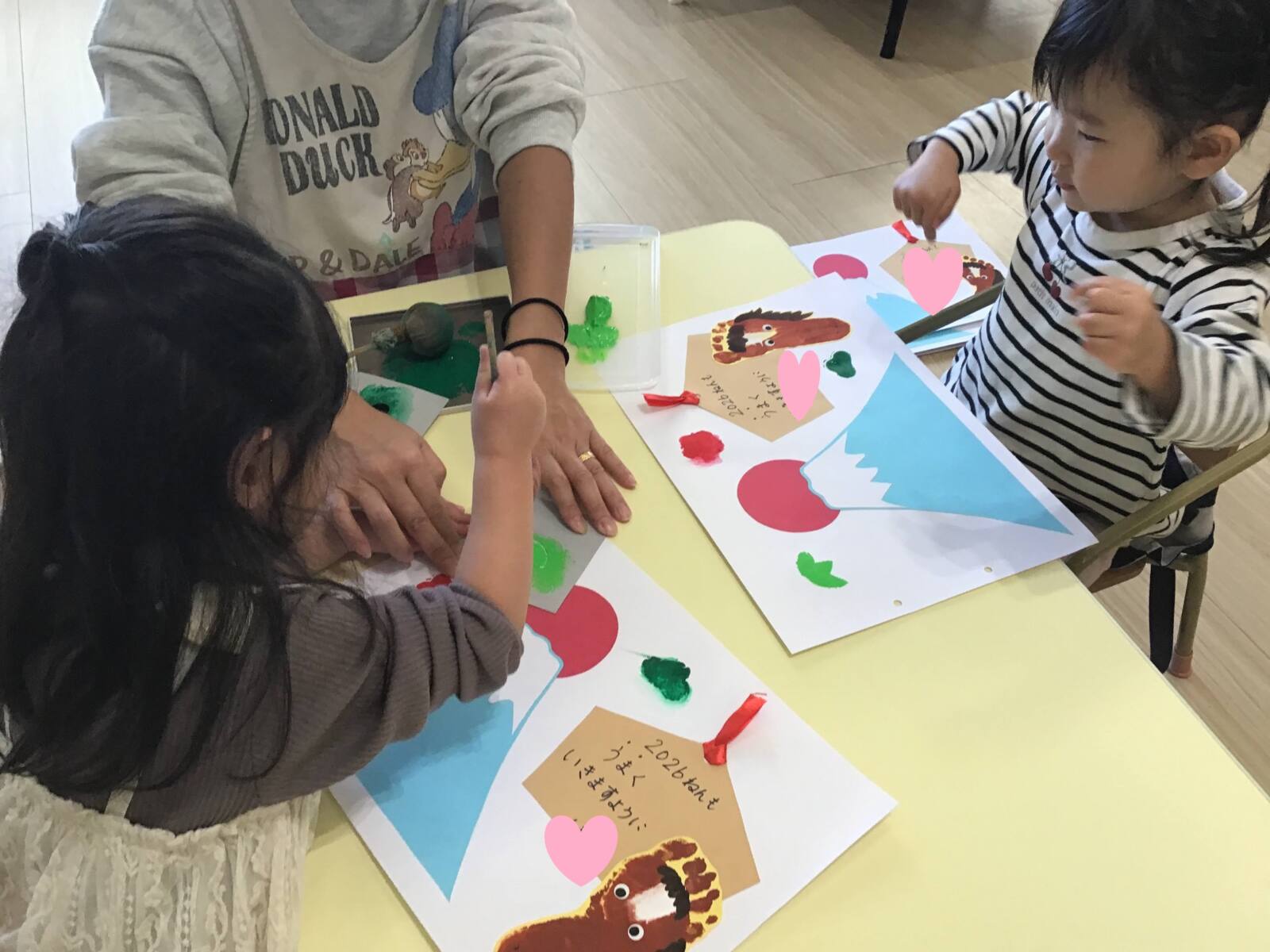 製作では、今年の干支「午」や絵馬について知り、「松竹梅」のスタンプで飾り付けしました👏🐎✨