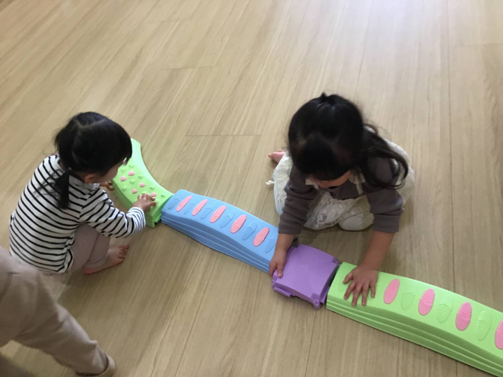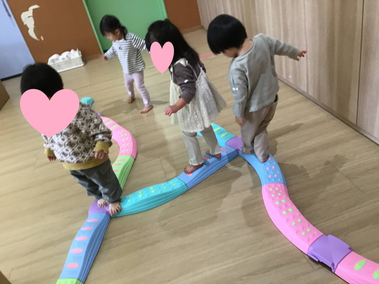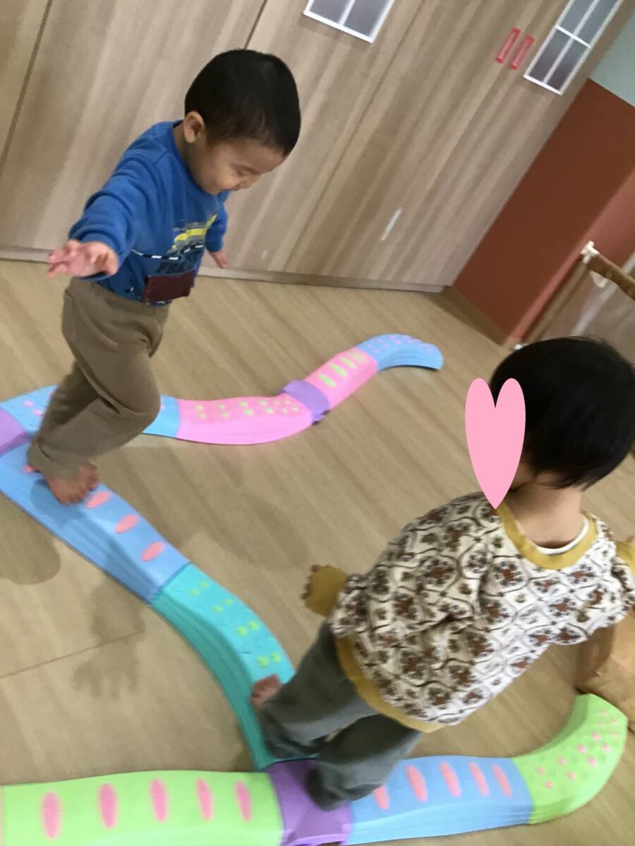 運動遊びでは、バランスストーンをみんなで組み合わせるところから行い、今日はどんな道ができるかな?とお話しながら作っています🎶✨バランスストーンの上を渡ることもとっても上手になってきています💕