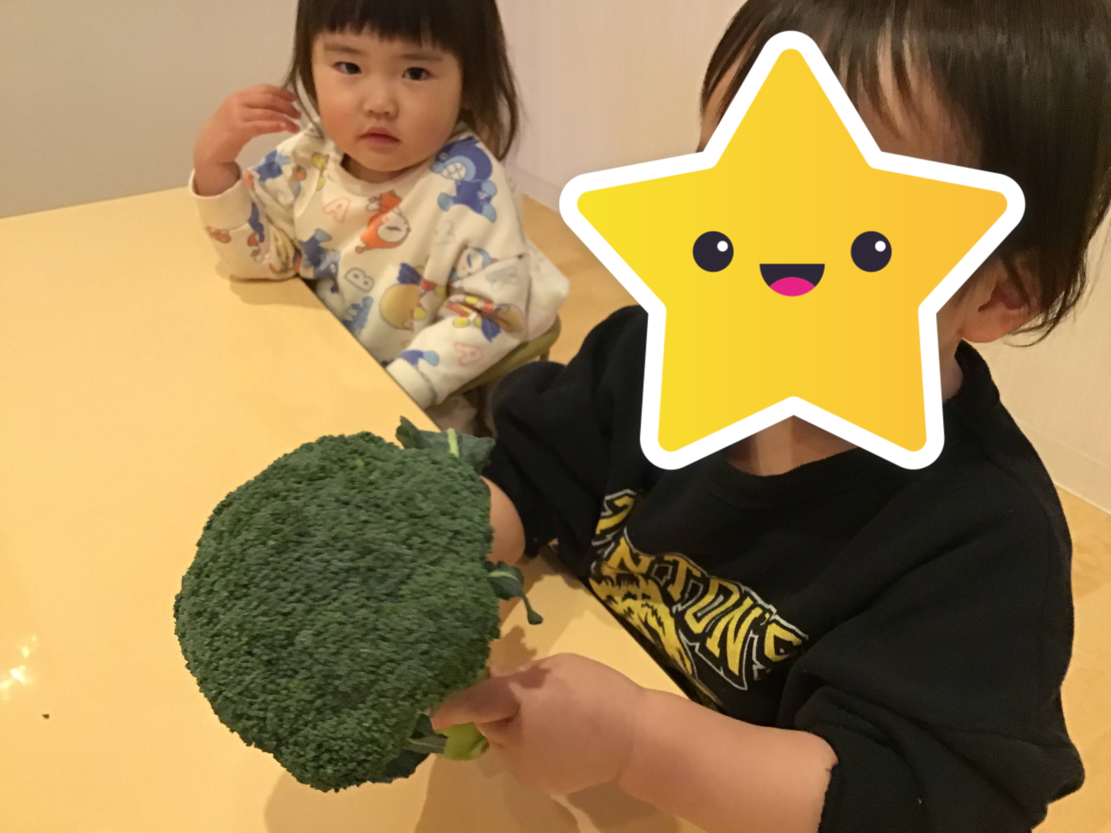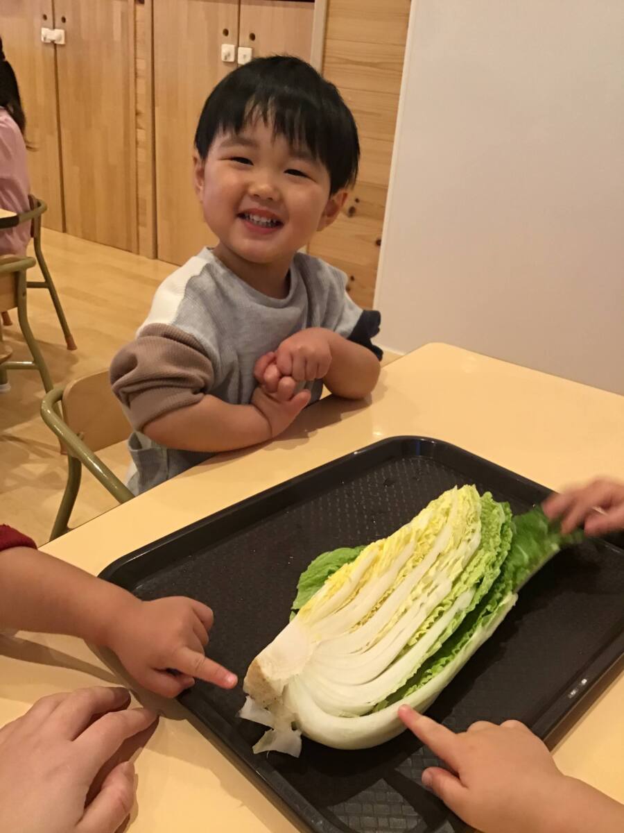 3種類のお野菜をみて「大きい!」「ちょっと柔らかいね、ここは硬いね」とお話しをしたり匂いや感触を楽しみました🥬