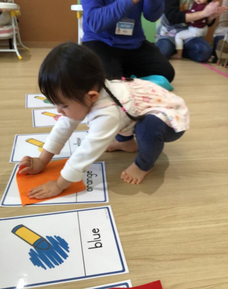 徐々に慣れてくると、「ブルー💙」「ピンク💗」と先生の言葉を真似したり、椅子から立ってみたりと