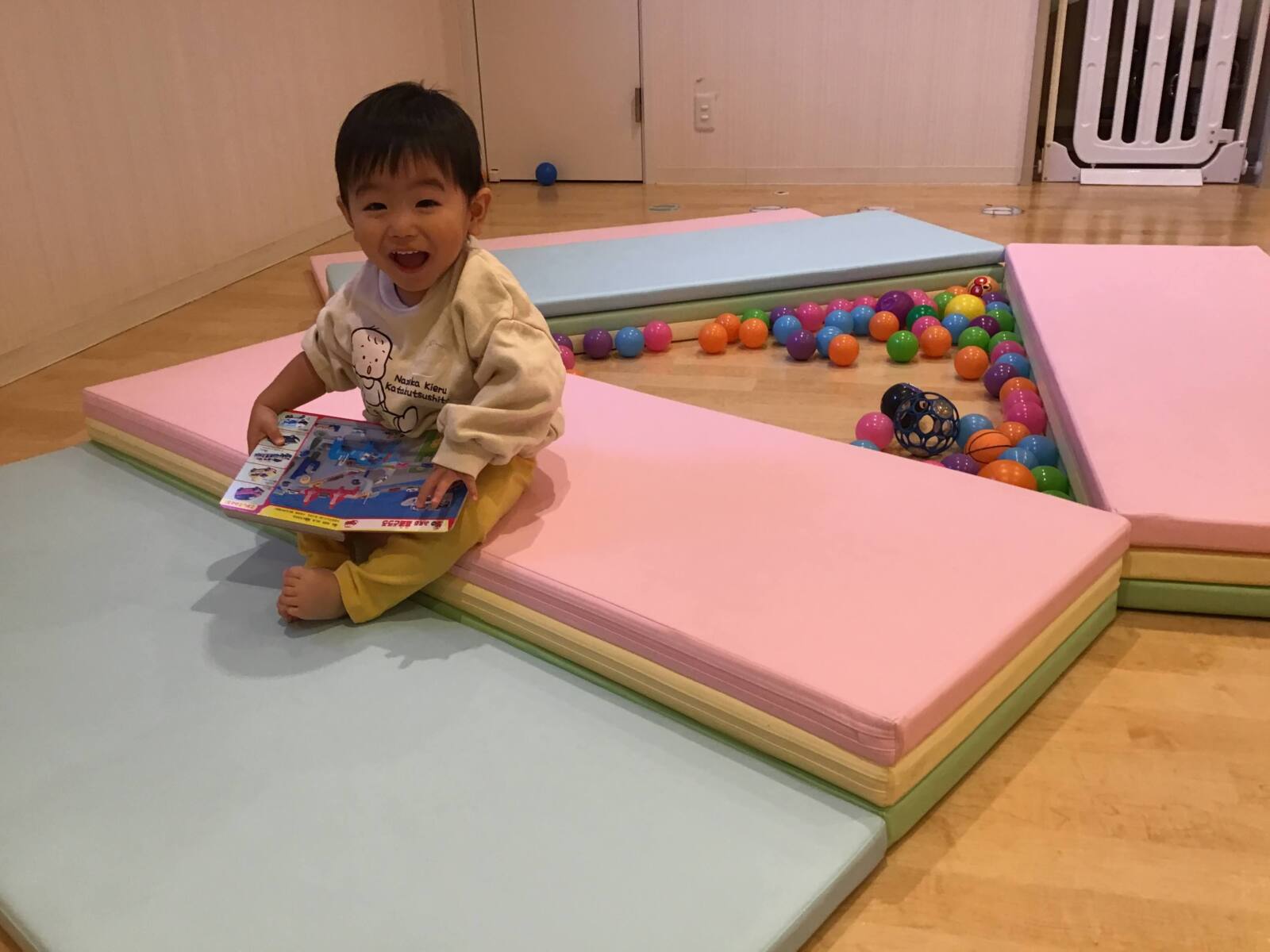 マットで囲んで作ったボールプールにダイブ❕