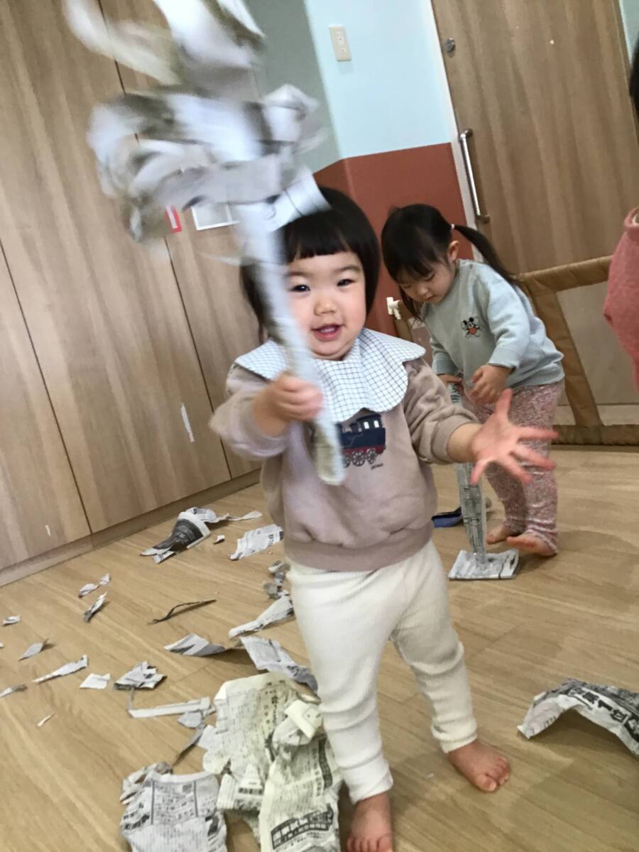 新聞紙をちぎったり、丸めたり、掃除機にしたり楽しく遊びました😋❄️