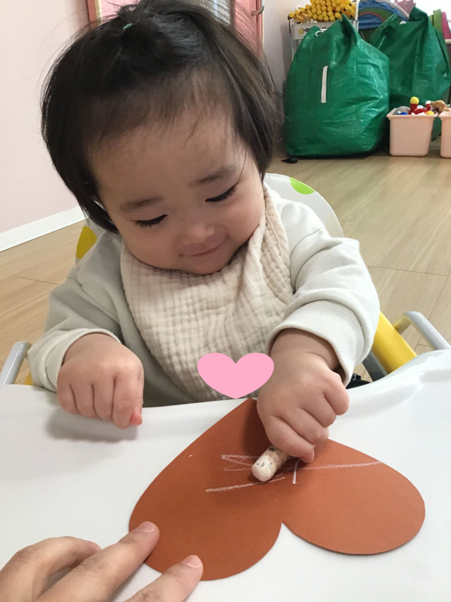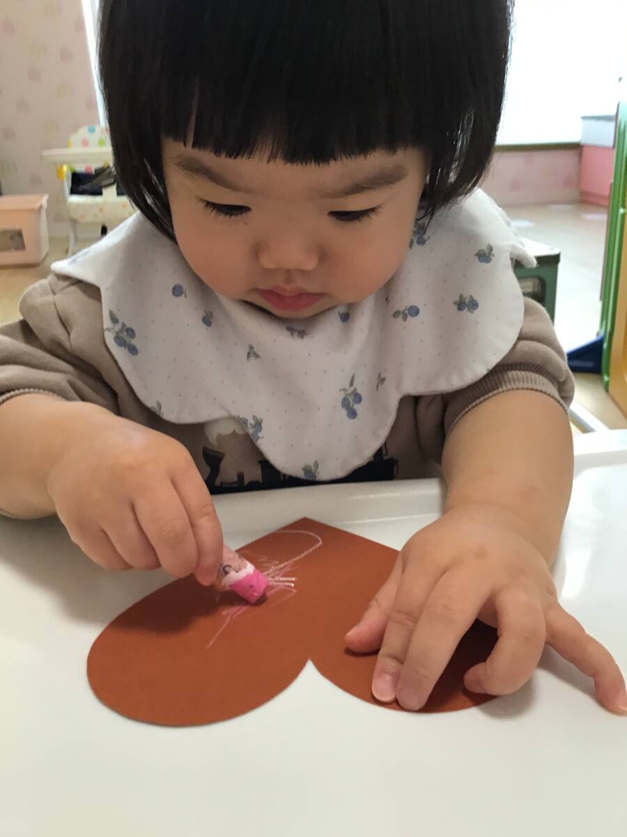 バレンタインをイメージして、ハート型の画用紙にクレヨンで殴り書きをしたり