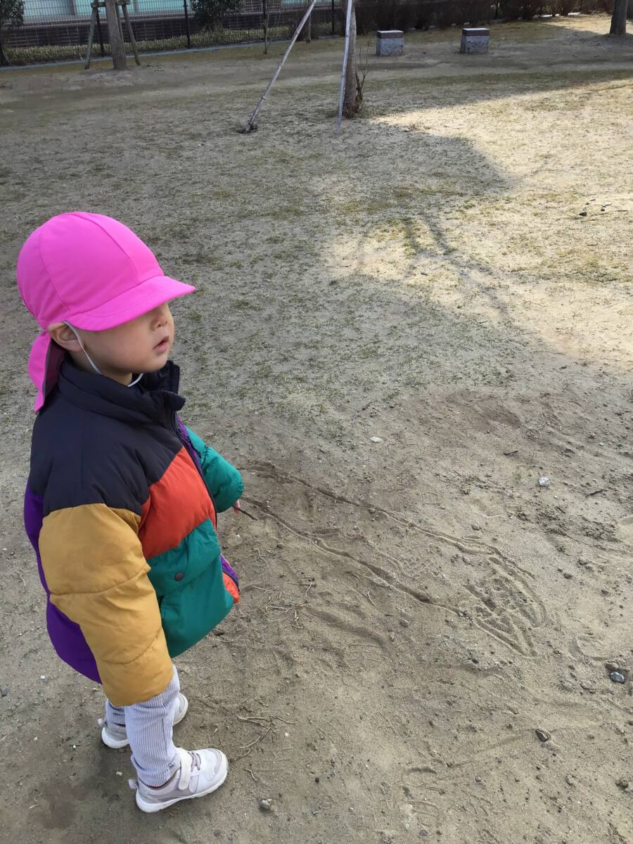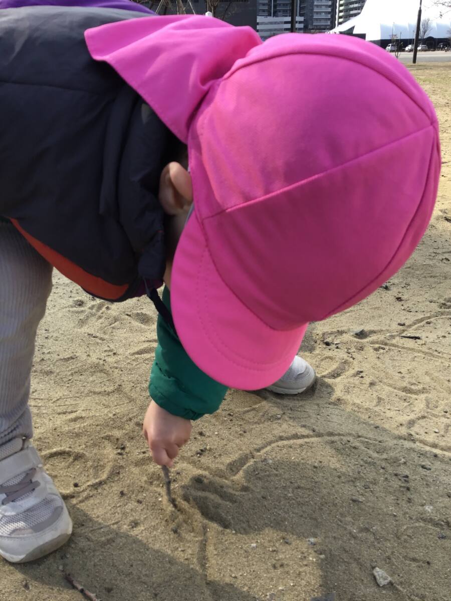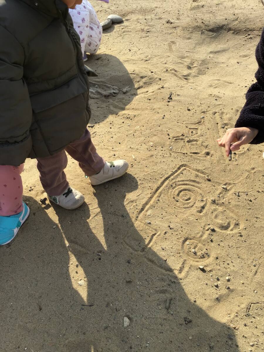 広場では、木の枝を使って絵を描いて楽しみました🎶