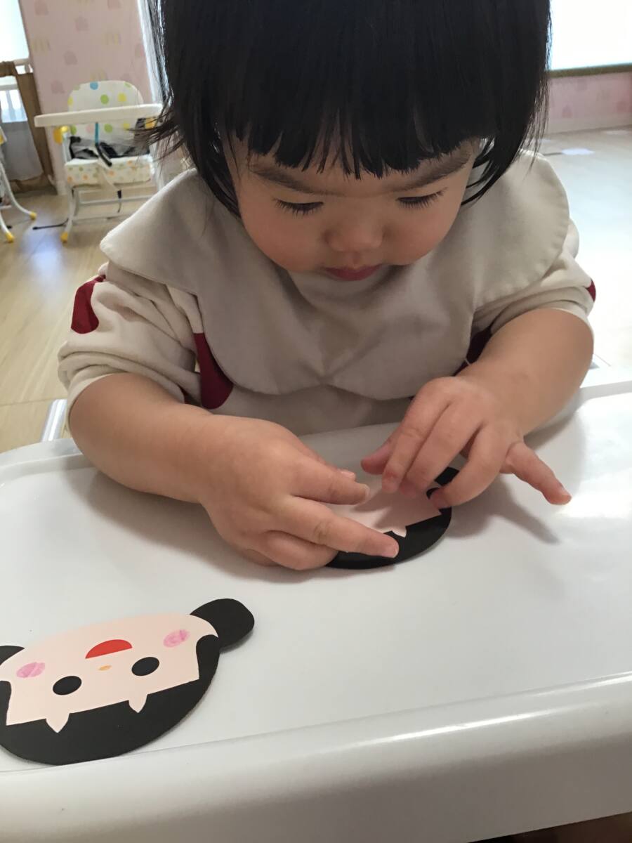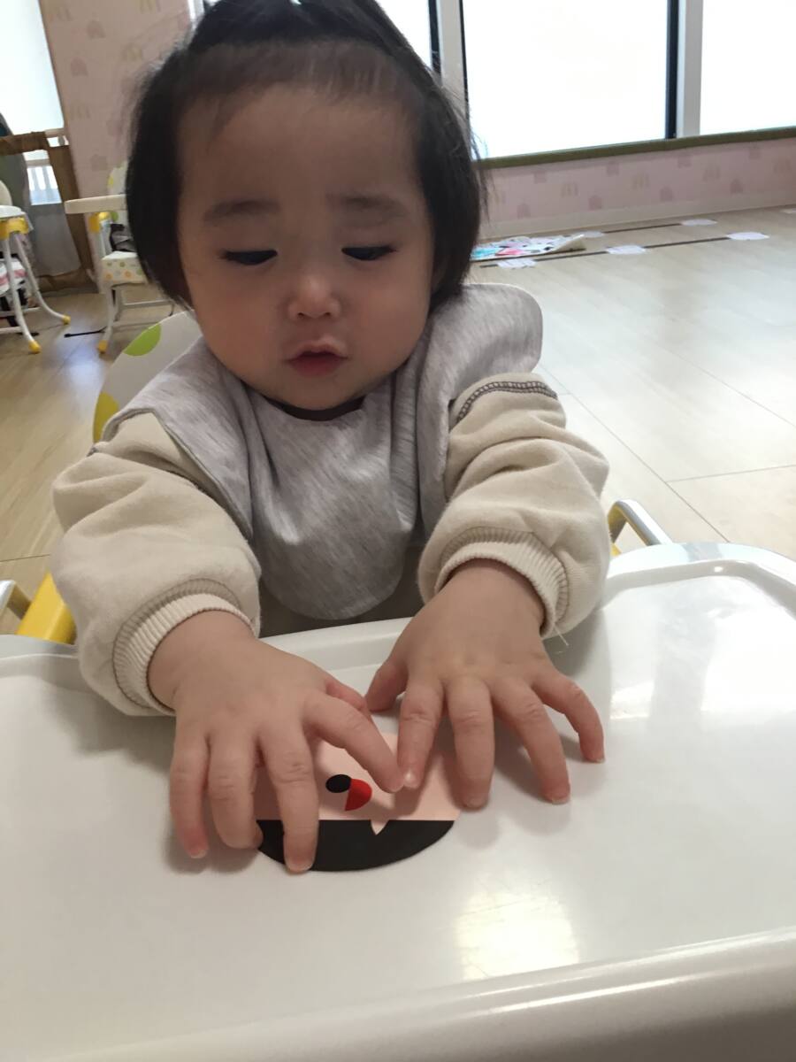 小さめのシールが手にくっついて苦戦しながらも可愛らしいお顔の完成です😊💕